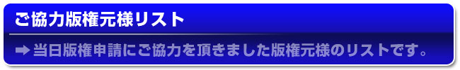 | ■当日版権申請受付可能版権元様リスト こちらではトレジャーフェスタ・ネオにおいて、現在、当日版権の申請を受付してくださる版権元様をご紹介いたします。 こちらに掲載されている版権元様は、現段階でサイト掲載を許可して戴いた版元様のみとなっています。許諾を戴いておりましても、現在契約手続き進行中の版元様や、交渉中、または受付可能だが掲載は不可との見解である版元様につきましては、こちらのページに掲載されておりません。詳しくは実行委員会までお問い合わせください。 尚、掲載されていない版元様におかれましても、実行委員会より交渉させて頂きます。仮申請前でも構いませんので、お気軽にご相談ください。 掲載許可をいただいた版権元様は順次アップさせていただきます。 このページをディーラー様のアイテム選択にご利用ください。 |